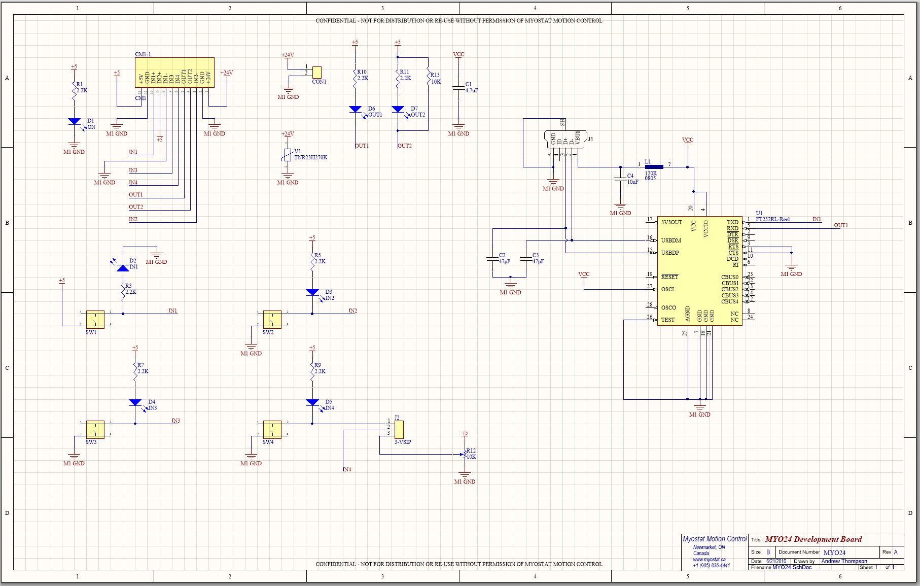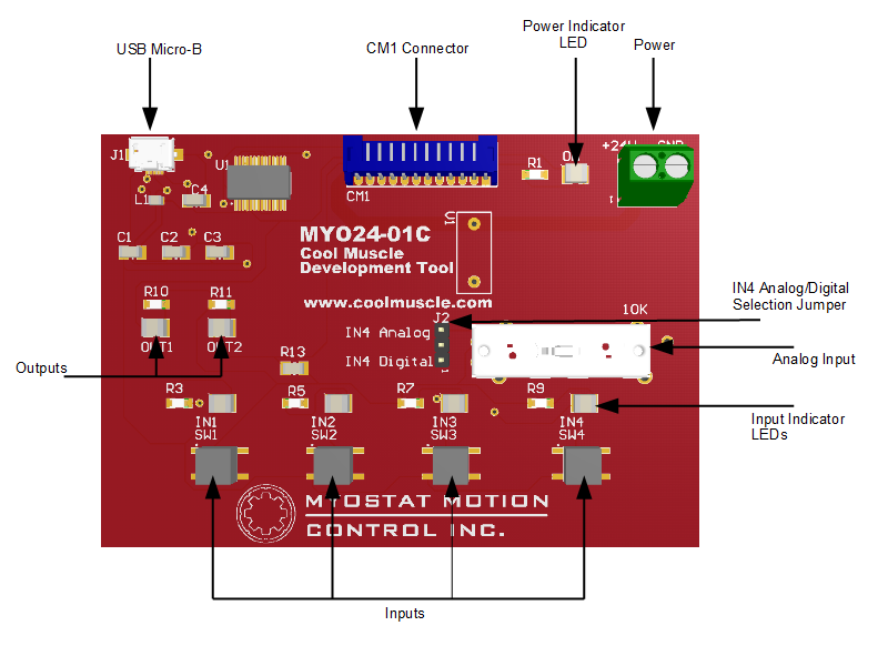 The MYO24 CM1 development tool is meant to be used as a simple and convenient method for testing programming and simulating inputs and outputs on the CM1 motor. The tool comes equipped with a USB converter for easy communications, four input buttons for simulating sensors and other inputs, a linear potentiometer for simulating an analog input, and two LEDs for showing the state of the motor outputs. The MYO24 connects to the motor easily using a 12-pin straight through cable.