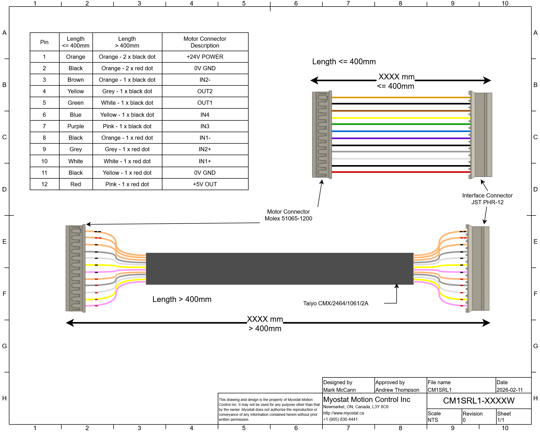 The CM1SRL1 cable is used as an interconnect cable between peripheral devices and the motor. It is a 12 conductor cable with a JST 12-pin header on the peripheral side and a Molex 12-pin . The cable is similar but should not be confused with a CM1C1 which is molex to molex.