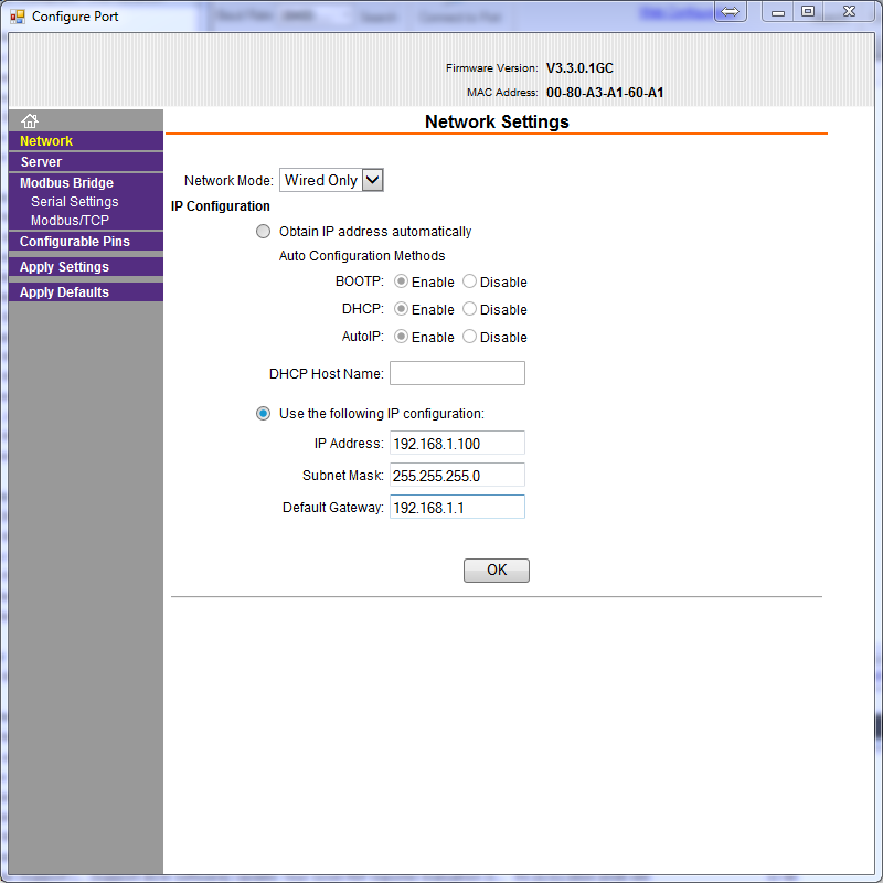 The user will want to setup the network settings for the Modbus TCP motor. This could include setting a static/dynamic IP and/or a password.