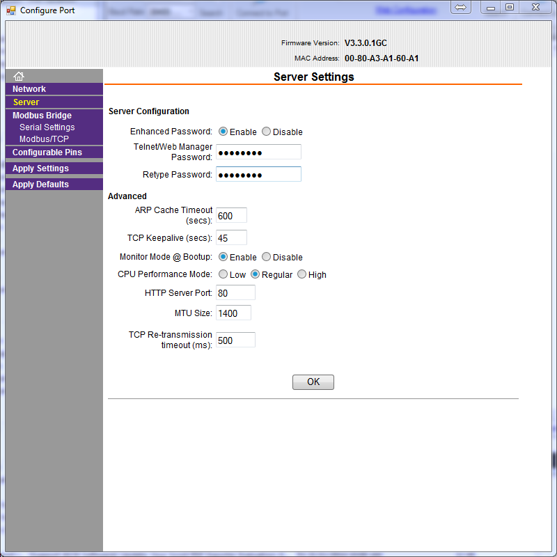 When you logon to the Modbus TCP web configuration page there are other Modbus related settings. These should be left as they are. If you reset the module to defaults please refer to the Configuring Modbus section at the bottom of this page.