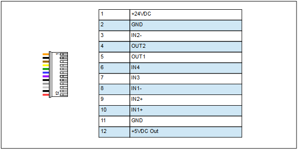 A five volt output and ground are also provided from the motor on pins 12 and 11 respectively. This can be used to power inputs and outputs, or other devices as required. The five volt output has a maximum current of 50mA.