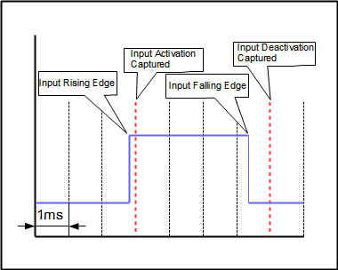 For the quick response conditions, the inputs are scanned every 1ms. This means that when the input is triggered, there is a maximum of 1ms before the input will register as activated within the motor, depending on where in the scanning cycle it is triggered. Likewise, when the input is shut off, there is a maximum of 1ms before the input will register as deactivated within the motor. The quick response logical high, rising edge, and falling edge functions are programmed in parameters K27, K28, and K29 respectively. Fig. 5 demonstrates the input activation cycle for the quick response input.
