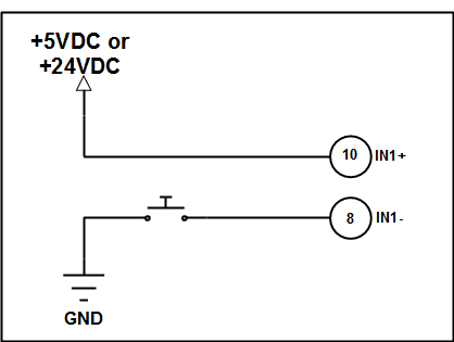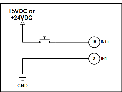 IN1 and IN2 can be configured as either sinking or sourcing inputs. They will function as long as the appropriate voltage is seen between the IN+ and IN- Terminals. The following examples utilize a push button to act as the input trigger. In reality this push button would often be replaced by an output from another device, such as a PLC, or other controller. IN1 and IN2 can operate at voltages up to 24VDC. Any of the below examples showing IN1 are also true for IN2.