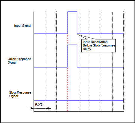 The slow response conditions are triggered at a programmable delay after the quick response is triggered. The delay can be found in parameter K25. For example, if the delay is programmed for 0.2sec in K25, when the input is activated, the quick response will trigger withing the next 1ms, and the slow response functions will trigger 0.2sec after that.