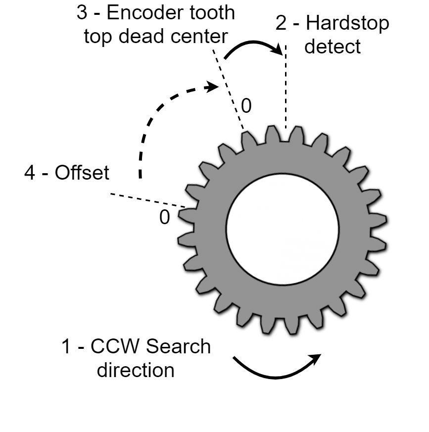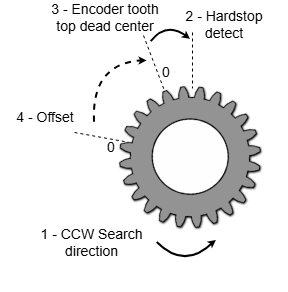 Motor backs CW up to the 2nd previous encoder tooth (improved repeatability) and sets the position to 0.