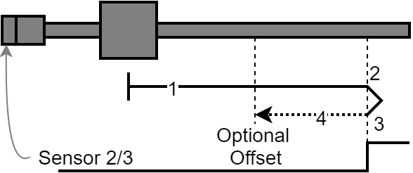 Sensor rising edge triggers the input, motor captures encoder position, decelerates and reverses direction