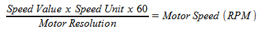 The speed parameters in the motor are measured in pulses per second. The values you program in the motor are a multiple of the speed unit that is set in parameter K37. By Default, this speed unit is set to 100 pulses per second. This means that if you set the motors speed value to 50, the rotational speed of the motor will be 100pps x 50 = 5000 pulses per second.