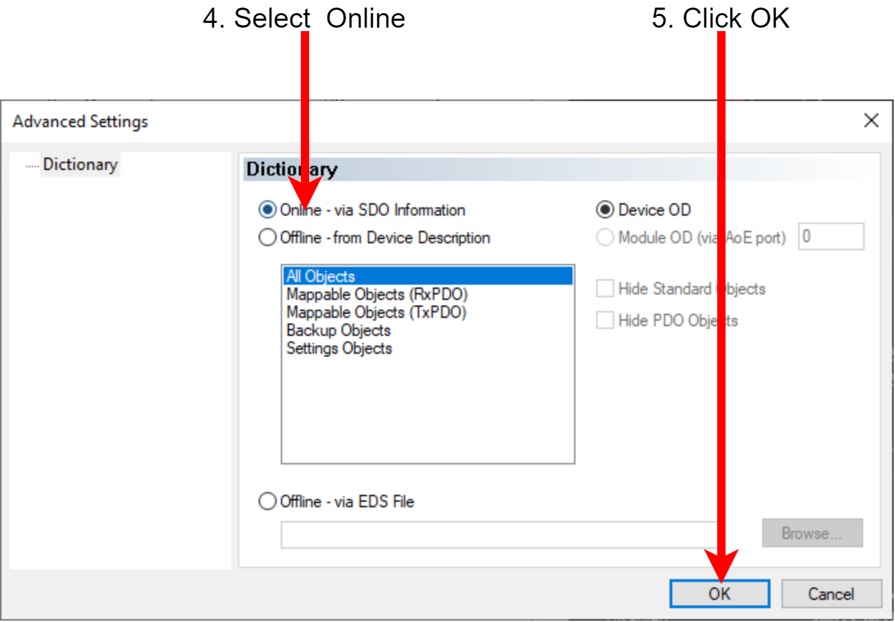 Select the CoE-Online tab. Only the objects listed in the EDS are currently listed.