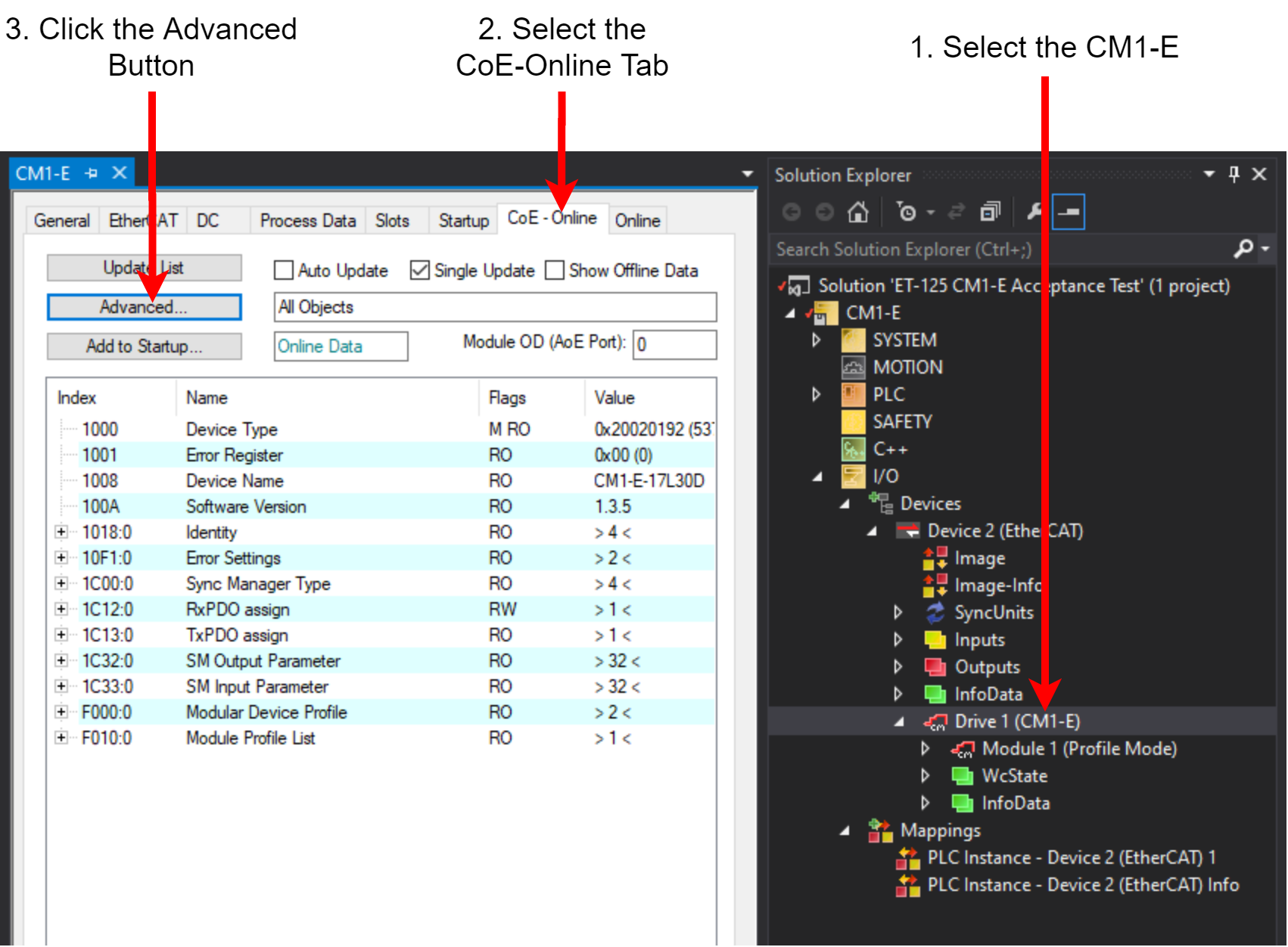 The following instructions show how to read/write the objects in TwinCAT3 through the online object dictionary. It assumes a CM1-E drive has already been added.