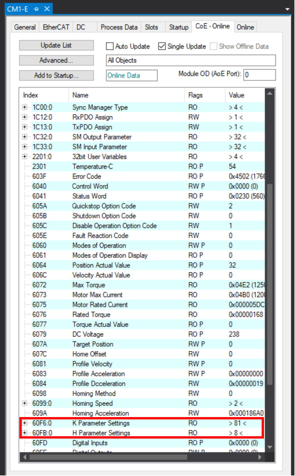 The full object dictionary is now available. The K and H parameters are shown below in red. Expand the list to see all the parameters.