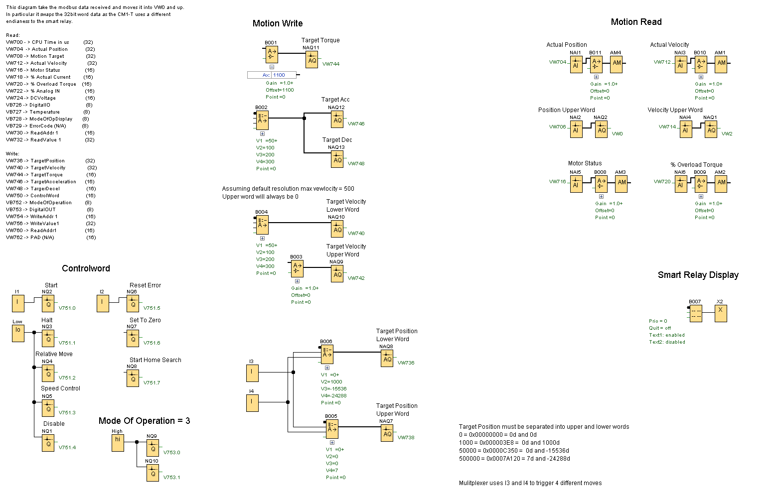 The IDEC FL1F smart relay can be setup as a Modbus TCP Client (master). The Smart Relay is able to control the motor by directly writing to motion registers. The attached example sets the following