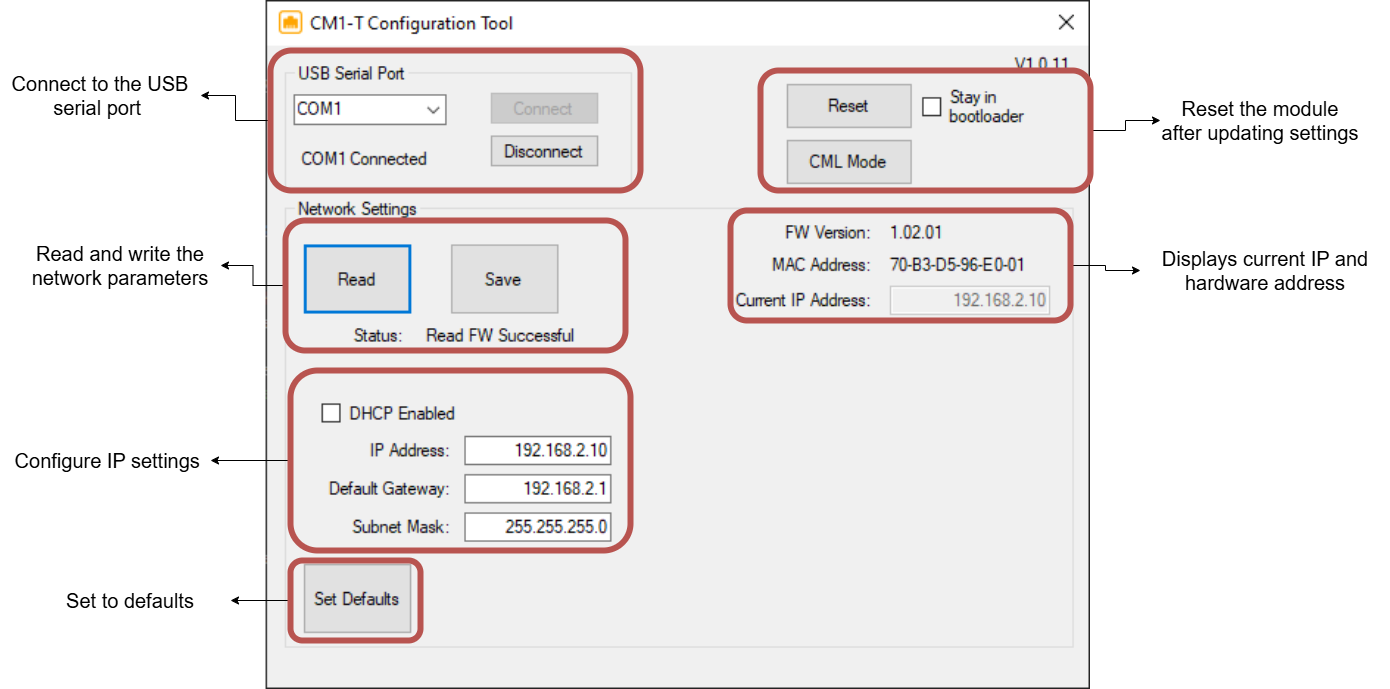 The network settings are configured through the CM1-T Configuration Tool application which connects to the USB on the back of the motor. This application also allows you to read the currently configured settings.