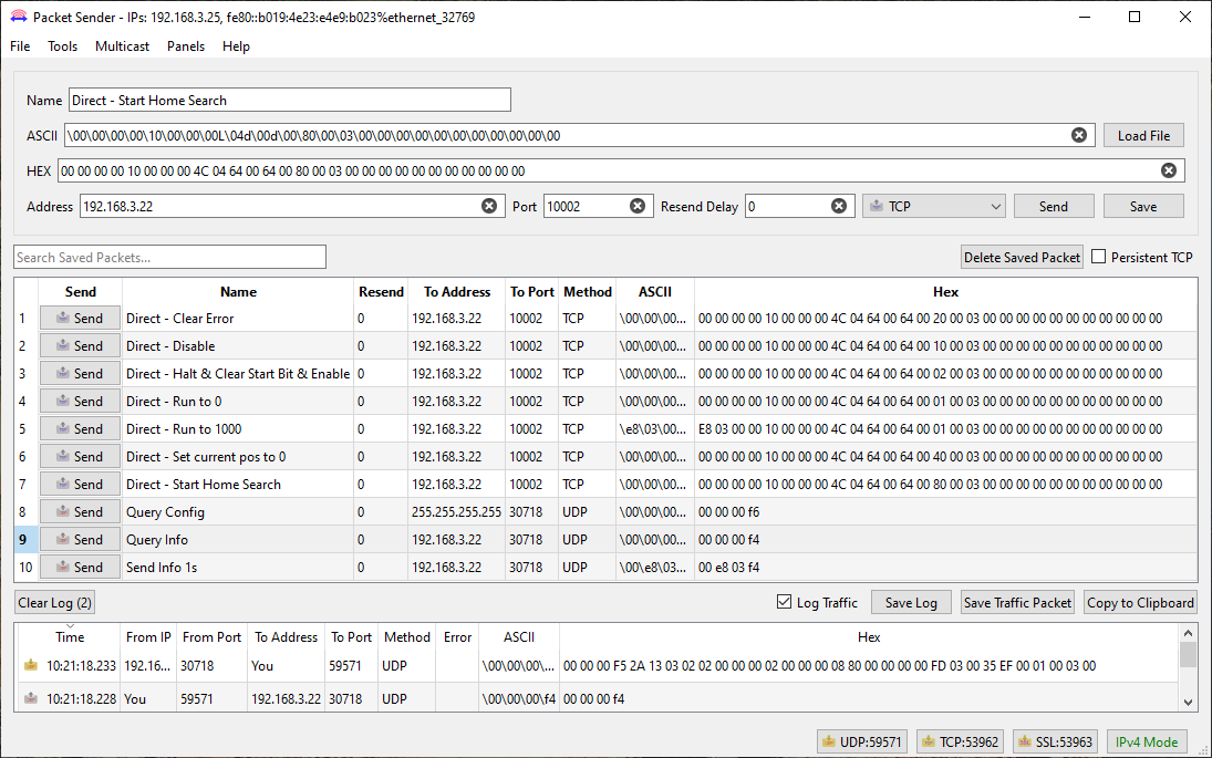 The following example uses Packet Sender to execute some direct moves, query configuration and query information.