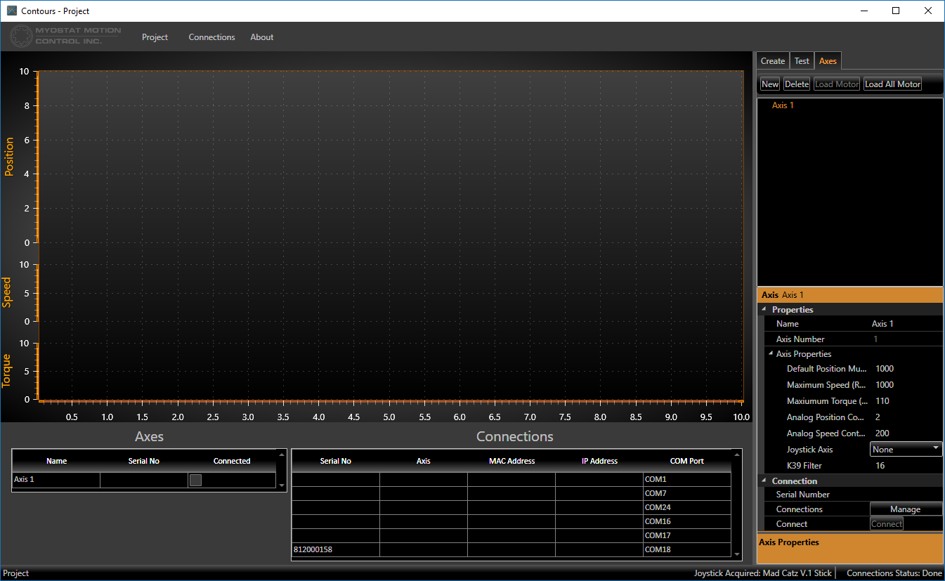When you open the connection manager, it will automatically scan all available COM ports for compatible motors as well as scanning the network for IP motors. Each motor is listed by its serial number. This ensures that even if a motor is on a dynamic IP which changes periodically, or if it is connected to another COM port, each motor is always associated with the correct axis.